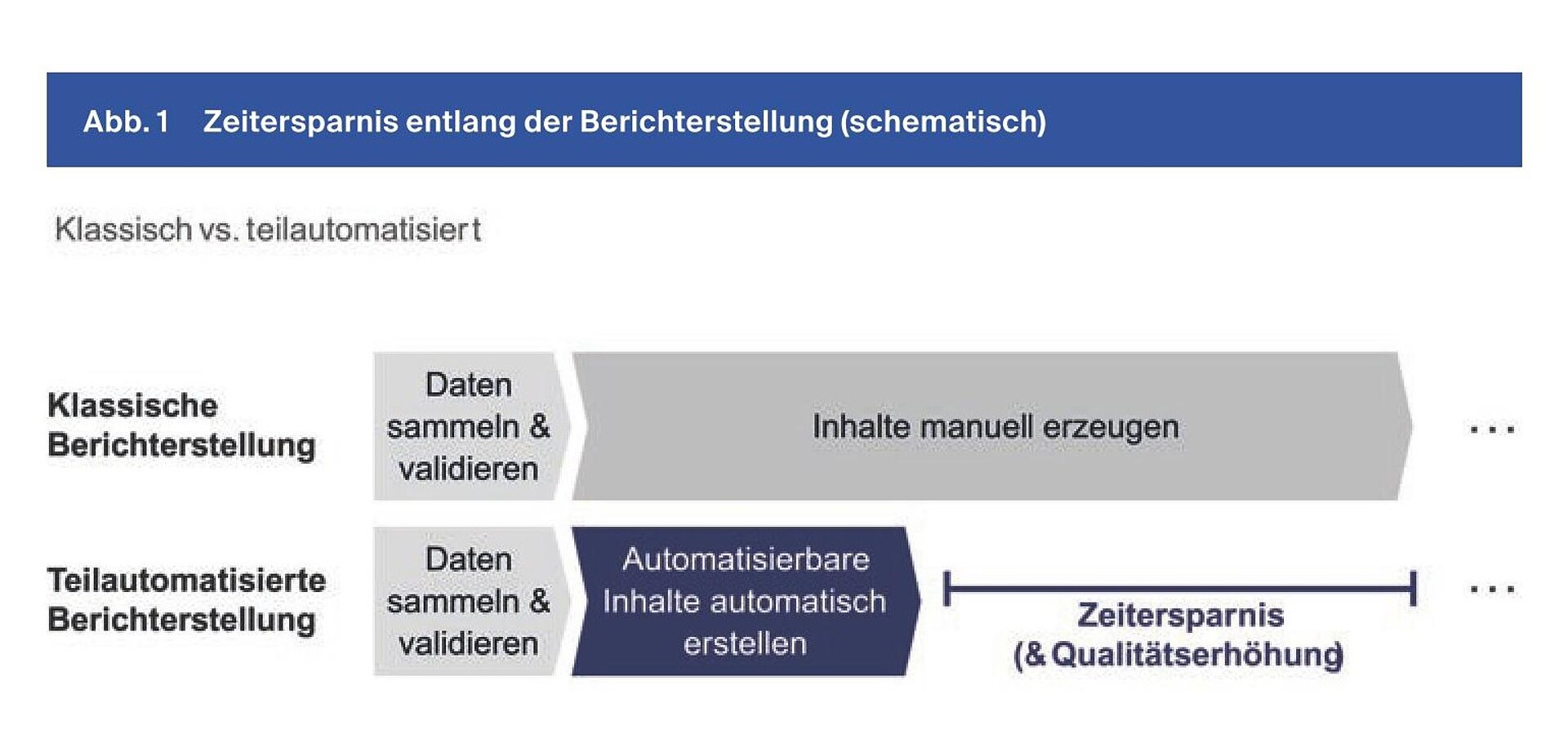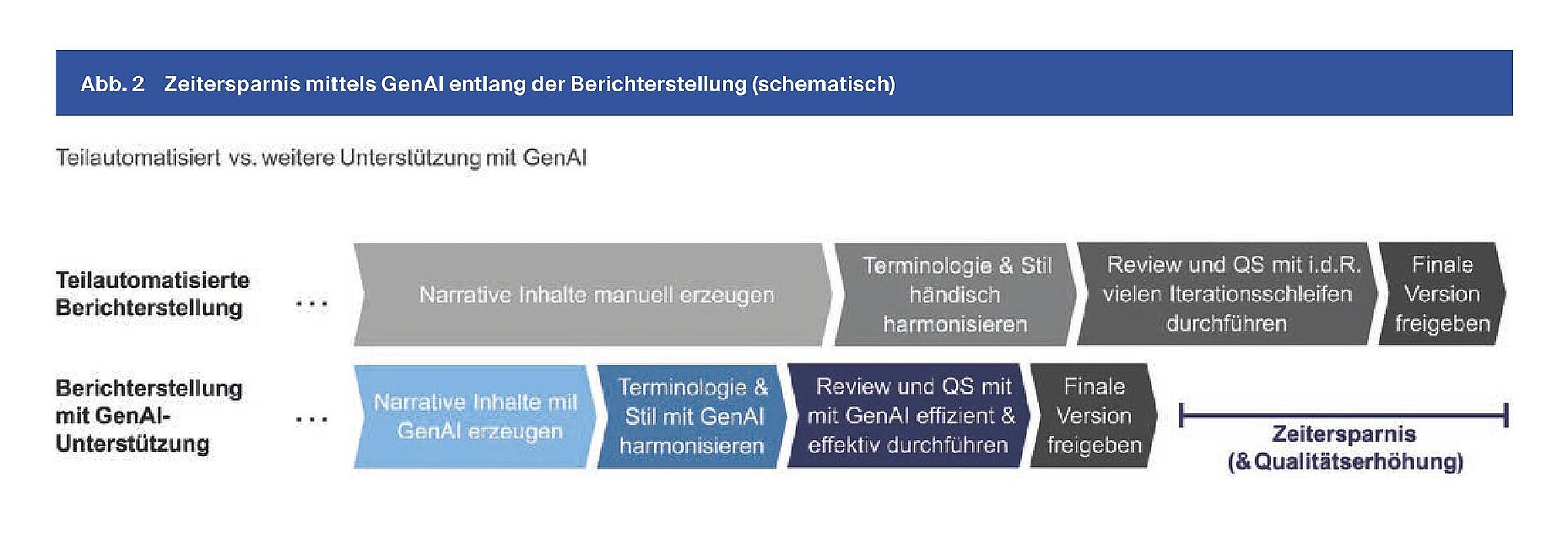 Eine teilautomatisierte Berichterstellung von Inhalten – wie in Abbildung 1 dargestellt – führt bereits zu einer spürbaren Zeitersparnis und einer höheren Ergebnisqualität für den ersten Prozessschritt der Berichterstellung. Dieser Mehrwert lässt sich durch eine GenAI-unterstützte Berichterstellung nochmals deutlich steigern, wie in Abbildung 2 veranschaulicht wird.