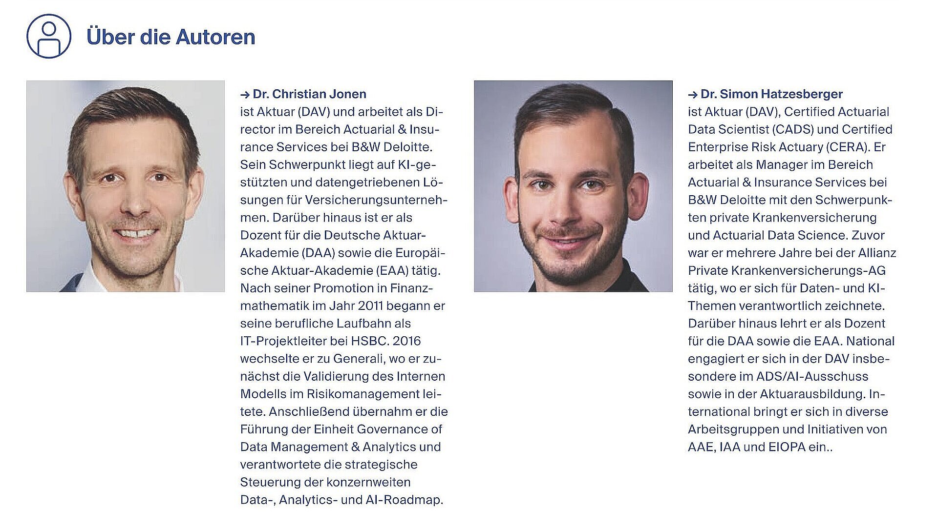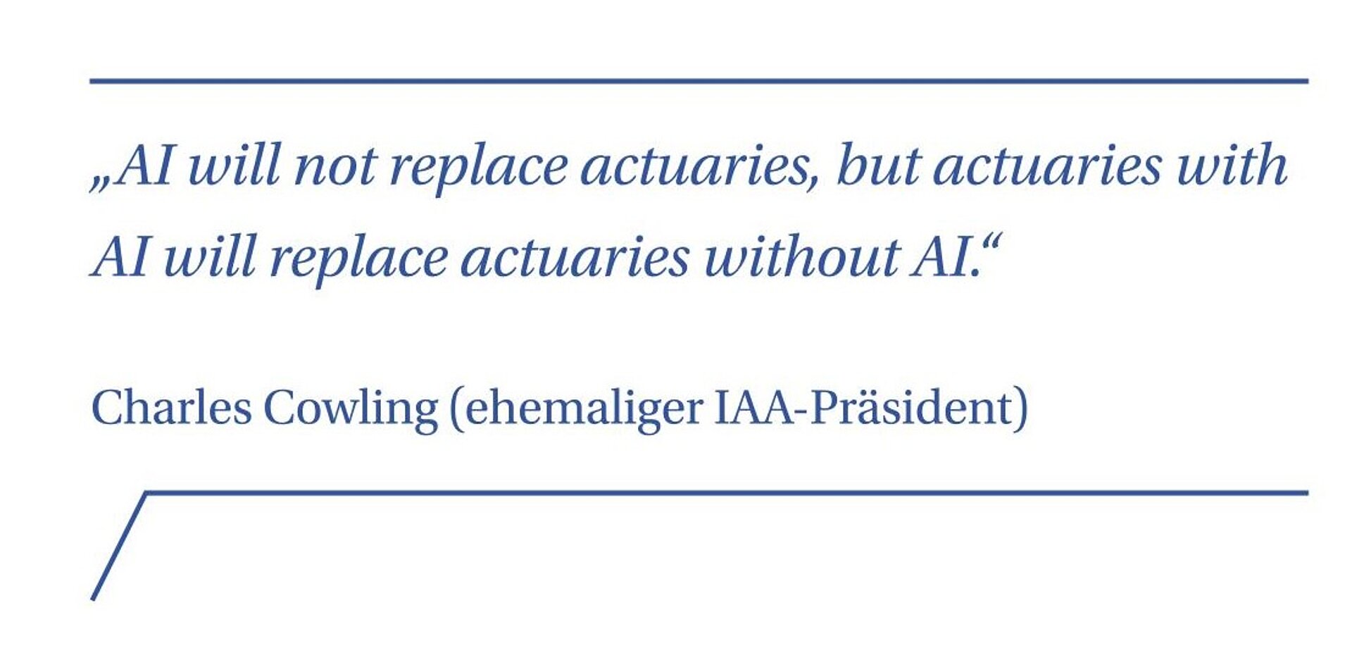 Entscheidend ist dabei ein realistisches Zielbild: Der Mensch bleibt „am Steuer“. GenAI liefert Entwürfe, alter native Formulierungen, Plausibilitäts- und Konsistenzhinweise – doch die fachliche Prüfung, die finale Freigabe und die Verantwortung verbleiben bei den Aktuarinnen und Aktuaren bzw. den verantwortlichen Funktionen. In diesem Sinne bringt es ein Zitat des ehemaligen IAA-Präsidenten Charles Cowling treffend auf den Punkt: „AI will not replace actuaries, but actuaries with AI will replace actuaries wit hout AI.“