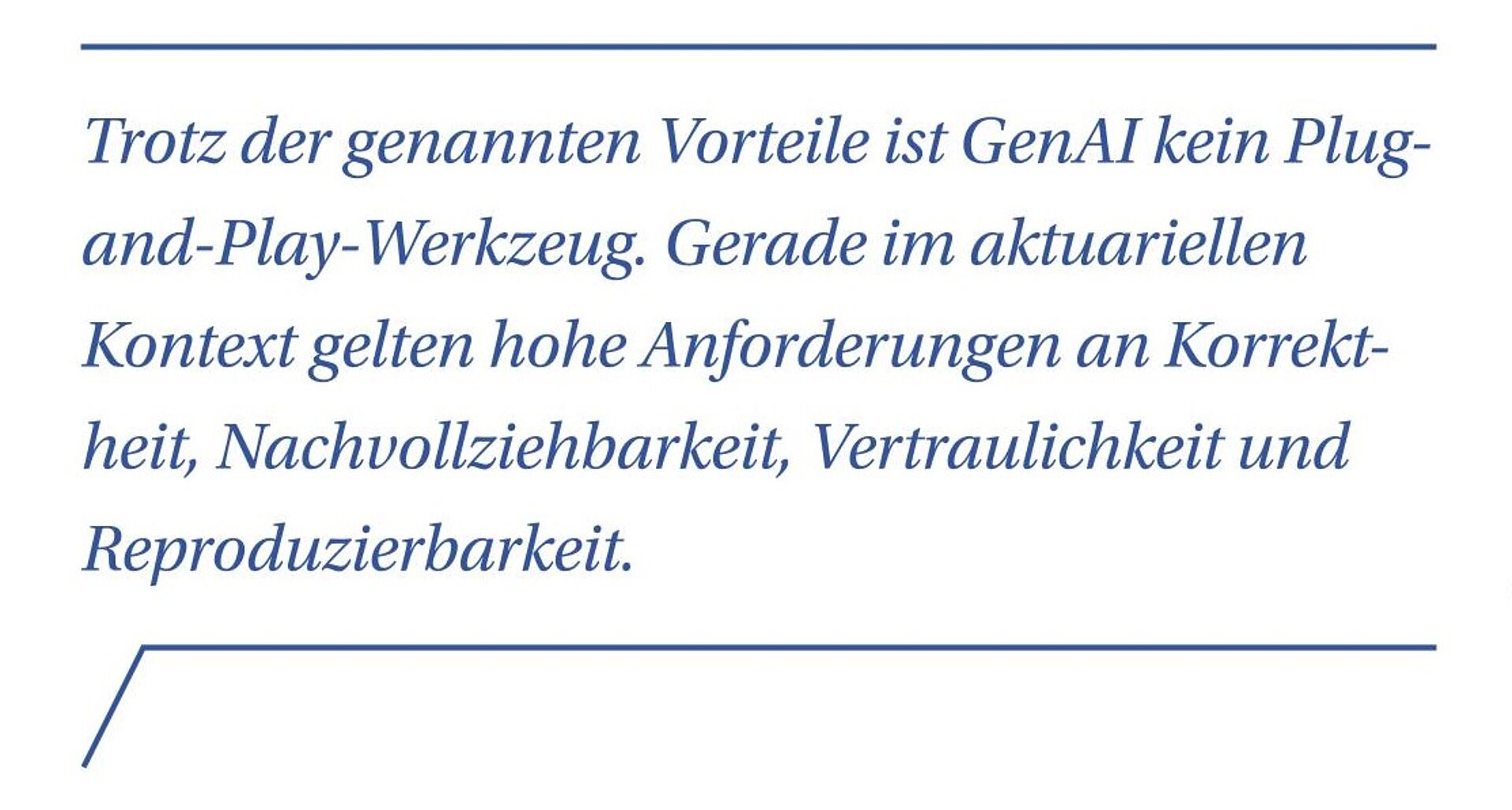 Trotz der genannten Vorteile ist GenAI kein Plug-and-Play Werkzeug. Gerade im aktuariellen Kontext gelten hohe Anforderungen an Korrektheit, Nachvollziehbarkeit, Ver-