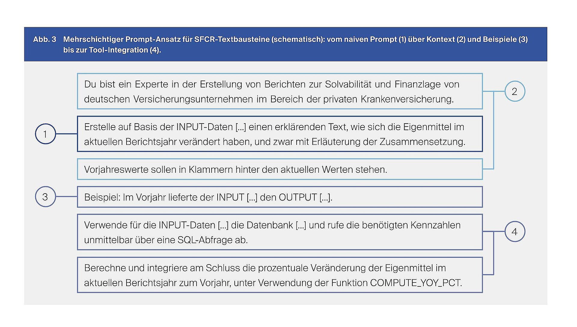 und schließlich um Tools ergänzt, etwa für Datenabfragen, Berechnungen oder Validierungen. Dadurch verschiebt sich die Rolle des LLMs von einer „freien Textgenerierung“ hin zu einer kontrollierten Formulierung auf Basis definierter Inputs. Abbildung 3 illustriert dieses Prinzip anhand sche matischer Beispielprompts für SFCR-Textbausteine.