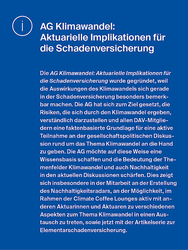 Um Aktuarinnen und Aktuaren eine informierte Begleitung der politischen Diskussionen zu ermöglichen, hat die Arbeitsgruppe Klimawandel: Implikationen für die Schadenversicherung die hierfür notwendigen Fakten zusammengestellt. Wir wollen die Annäherung an das Thema in drei Schritten vornehmen. In diesem 1. Teil werden wir die grundlegenden Aspekte einer Naturgefahrenversicherung